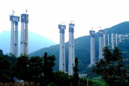 龙潭河特大桥,正在建设中的沪蓉西高速公路的重点控制工程,横跨800多米宽的湖北长阳榔坪镇龙潭河谷,主桥设计为5跨(106m + 3 x 200m+106m)变截面预应力混凝土连续刚构箱梁桥,分左右两幅布置;下部结构采用双肢变截面空心墩与桩基础,其最大桥墩高达178米,创下连续钢构箱梁桥墩高度的世界之最。